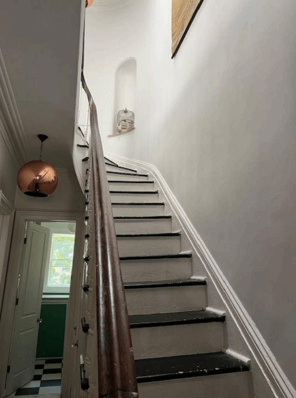 Urban legend has it that this alcove as you round the corner to come downstairs is known as a “coffin corner”. Whilst imaginative and evocative, the truth is more prosaic. It is merely a niche or an alcove designed to display vases, flowers, or in my house a slightly battered birdcase.